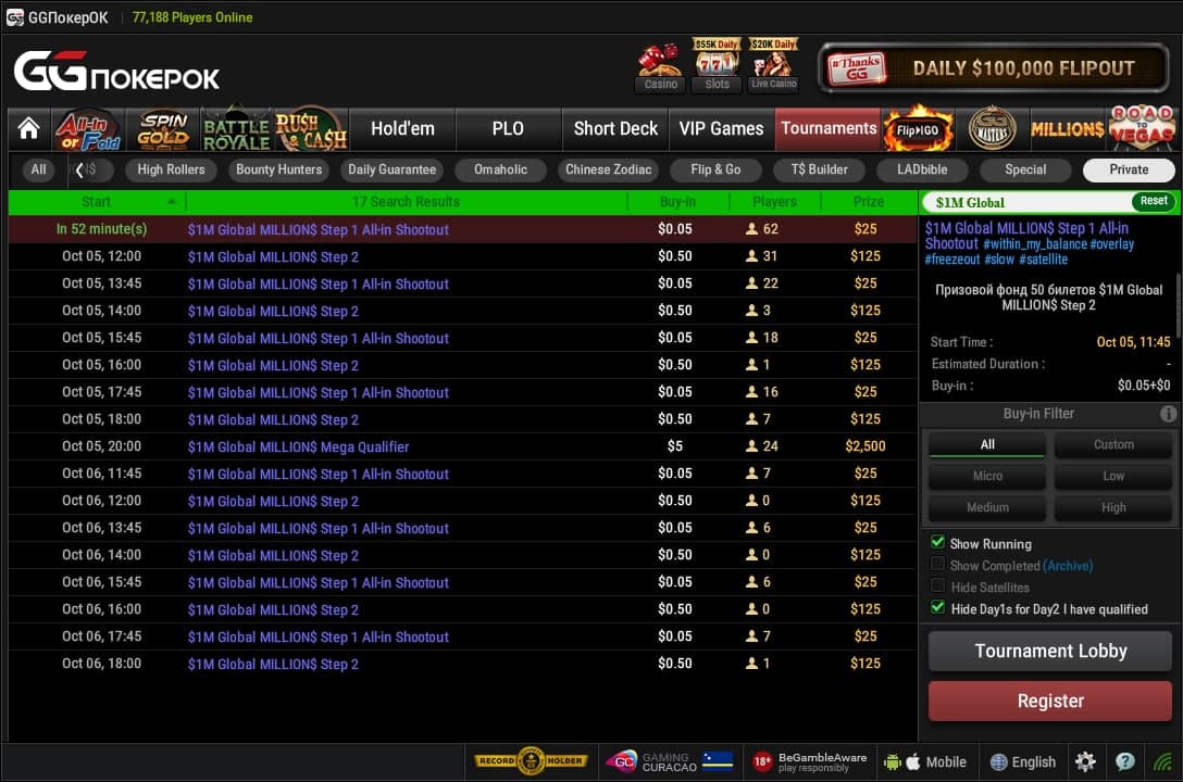 🔥Каждую неделю на GGпокерке проходит турнир Global MILLION$ с призовым фондом $1,000,000: билет обойдется в $50, а зарегистрироваться можно в одном из доступных стартовых дней. Финалы стартуют по воскресеньям в 23:30 по Москве.