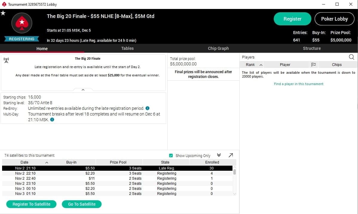 Завершится серия эпичным мейном с бай-ином $50 и гарантией $5 млн (на 100,000 человек!), турнир пройдет в воскресенье 5 декабря (уже доступен в лобби, называется The Big 20 Finale, сателлиты вовсю идут).