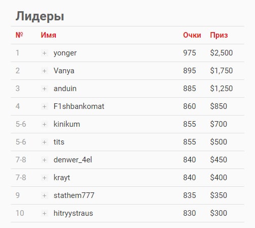 🎫 $2,500 в спинах. За каждый доллар рейка начисляется одно очко в лидерборд, призовые 50 лучшим выплачиваются билетами в спины.