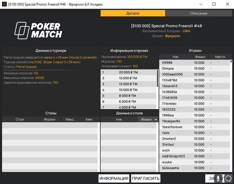 ⚽️ 21 декабря. По вторникам игроки, зарегистрированные на PokerMatch от GipsyTeam, играют фриролл на 3,000 гривен в 21:00. В это же время начнется фриролл на 20,000 гривен. Для участия нужно сделать депозит с кодом FREEROLL или просто наиграть 250 гривен рейка.