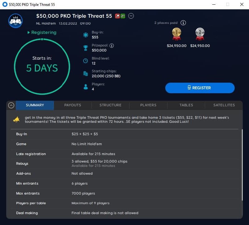 ♦️21:00: $50,000 PKO Triple Threat за $55