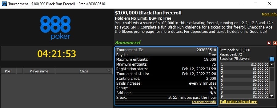 🏂 Сегодня большой день для бесплатной игры на 888poker. В 19:01 начнется фриролл на $5,450 для игроков уровня 40 и выше. В 19:25 — Green Run на $1,000. В 19:34 — сателлит на Sunday Big Shot за $109 с 10 билетами. А в 22:20 стартует первый (из трех запланированных до апреля) фриролл на $100,000.