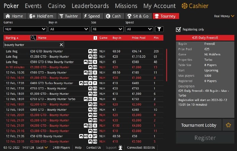 В день проходит множество турниров Bounty Hunter с бай-инами от €0.5 до €100, их легко найти по поиску в лобби (в зачет идут бай-ины от €5).
