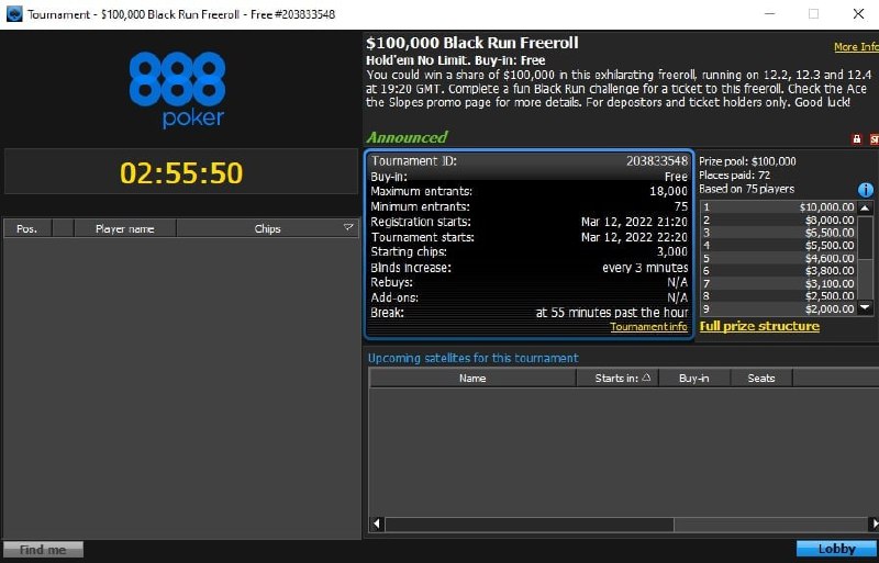 🏂 Завтра, 13 марта. На 888poker есть хорошие фрироллы и без билетов за выполнение миссий. Например, в 23:01 можно сыграть The $500 Fabulous Winner Spinner Freeroll (тикет падает из колеса фортуны), а минутой позже — $1,200 Kickoff.