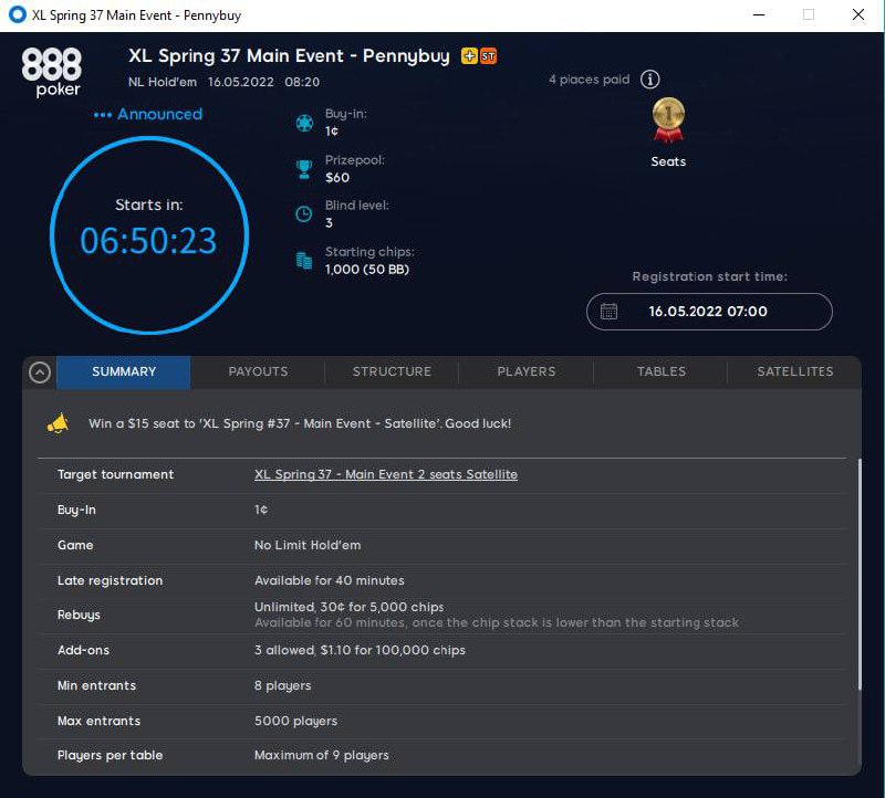 💰Выиграть путевку в главный турнир в ежедневных фрироллах XL Spring Series Freeroll (идут до 2 июня, только для депозиторов) или сателлитах от $0.01.
