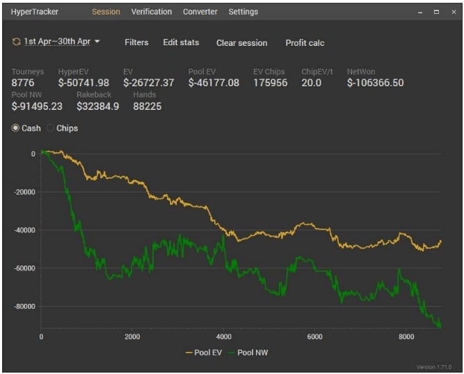 Вчера известный рег спинов sweetcoqueta в блоге решил посчитать, сколько денег он «потерял» из-за того, что давно играет в пуле. Благо, дистанция приличная: за последние 14 месяцев он сыграл больше 234,000 турниров! Иллюстрация адской дисперсии получилась идеальной: сначала он полгода жестко недобирал по EV ($22,000), пул компенсировал ему потери. А потом стал печатать деньги — и уже сам озолотил пул на $43,000. При этом он доволен, что ни разу не проигрывал за месяц больше 800 бай-инов 👍