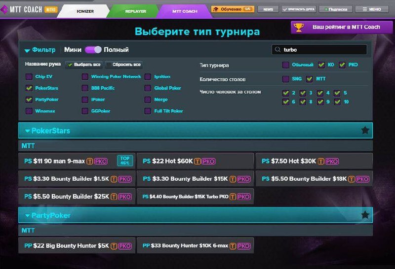 🧑🏻💻 Обновленный ICMIZER3. Встроенный пуш-фолд тренер SnG Coach давно перерос свое старое имя и теперь называется MTT Coach. Там можно отрабатывать решения во всех стадиях и типах турниров. А в обновлении ICMIZER 3.20.0 появилась удобная система фильтров и поиск МТТ по названию.