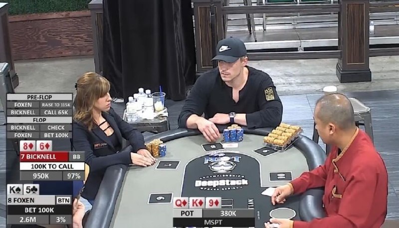 4 года назад в топ-3 турнира за $5,000 в Venetian остались Кристен Бикнелл, Алекс Фоксен и Кайл Бернс. Последний оказался в непростом положении: Кристен и Алекс тогда уже были парой (сегодня они муж и жена). После упорной борьбы Кайл выбыл на третьем месте. Финалку транслировали с открытыми картами, и за это время Алекс и Кристен успели сыграть друг против друга пару очень спорных раздач 🤔