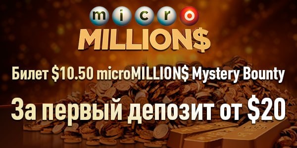 Если вы никогда не играли на ПокерОК (или создали учетную запись, но не вносили средства на счет), то до 2 июля сможете получить билет на серию microMILLION$ стоимостью $10.5 за первый депозит от $20.