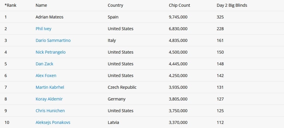 Привлекло элитное соревнование и опытных любителей: среди них богачи Лирон Шимон, Альфред Декаролис, бизнесвумен Кэти Лэйн и магнат гостиничного бизнеса Нилеш Пател. Последний играл этот турнир и в прошлом году, вылетев с АА против 88 будущего чемпиона, Адриана Матеоса. Теперь у него есть шанс расквитаться с обидчиком, но не очень высокий: Матеос закончил первый день большим чиплидером (325 ББ). Второй стек у Фила Айви (228 ББ).