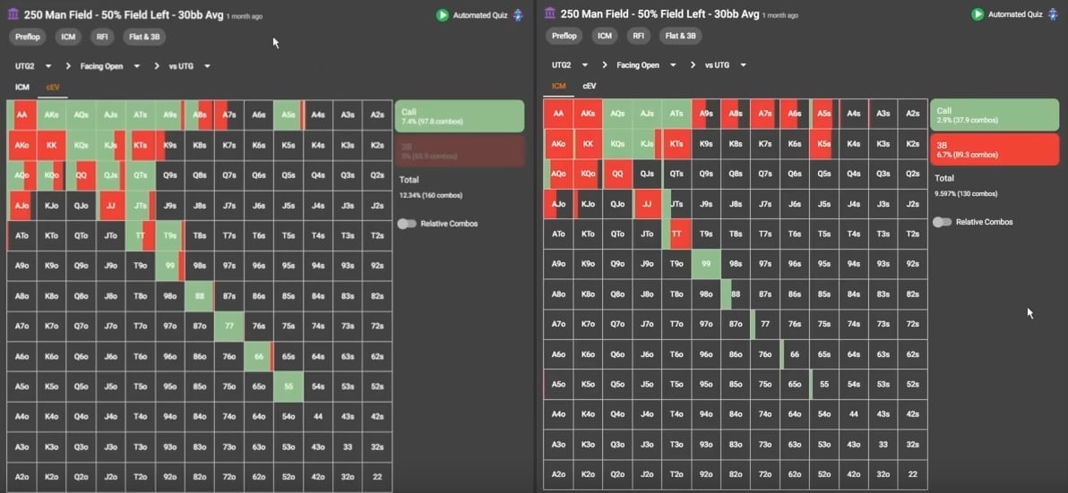 🗣 «Все слышали про ICM, но многие до сих пор считают, что модель имеет значение только на баббле и в ITM. Но благодаря софту (ICMIZER и HRC) мы смогли проанализировать влияние ICM на диапазоны на всех стадиях МТТ. Мы сравнивали диапазоны, учитывающие ICM, с ренджами Chip EV . И разница потрясающая, причем задолго до денег».