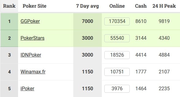 📈 Рекорд и антирекорд трафика. Румы сети GG тем временем вышли на новый пик: по данным сайта PokerScout, за последнюю неделю за кэш-столами там играли в среднем 7,000 человек (на пике 9,800). А PokerStars переживает самые мрачные времена: 3,000 игроков (на пике 4,300) — это почти вдвое меньше, чем до ухода рума из России.