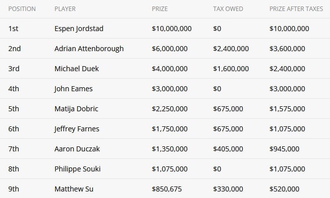 Родная Хорватия заберет у Матии Добрича $675,000 из $2,25 млн, которые он заработал за 5 место: на все выигрыши больше $67k там налог 30%. Канадец Аарон Дузак отдаст $405,000 из полагающихся за 7 место $1.35 млн, то есть в итоге получит меньше, чем Филипп Суки за восьмое. Всего из $30.27 млн призовых на финалке игроки заплатят около $6.1 млн налогов. В прошлом году было $5 млн (живущий в Австрии Корай Альдемир не отдал ни копейки), а в 2019-м аж $12 млн — во многом из-за немца Хоссейна Энсана, который из своих $10 млн перечислил в казну Германии почти половину.
