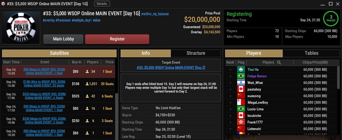 🕺 WSOP Online. В мейне за $5,000 осталось всего 2 флайта, сегодня и завтра, оба стартуют в 21:30. Чтобы побить гарантию в $20 млн, нужны 4,210 входов, пока их 3,340 — оверлея, видимо, не будет. В день 2, который начнется в понедельник, уже прошли 490 человек, в том числе Патрик Леонард, Линус Лелигер, Анатолий Филатов и Глеб Тремзин. Как минимум трое игроков за финалкой получат больше $1 млн. Сателлитов в эти выходные будет еще очень много, прямые — от $80.