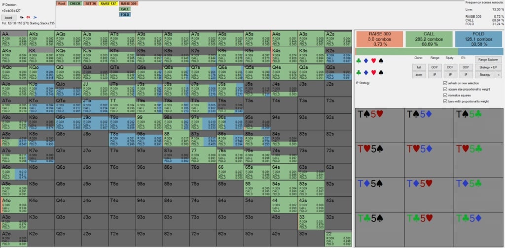 💰 Чем меньше ставка оппонента, тем чаще стоит рейзить. Это будет полезно и с велью-руками (разгоняете банк), и с блефами — оппоненту будет сложно продолжать с руками средней силы и слабыми полублефами. Если соперник ставит мелкую ставку, расширяйте и диапазон чек-рейза на велью, в первую очередь с топ-парами. Солвер одобряет эту стратегию.