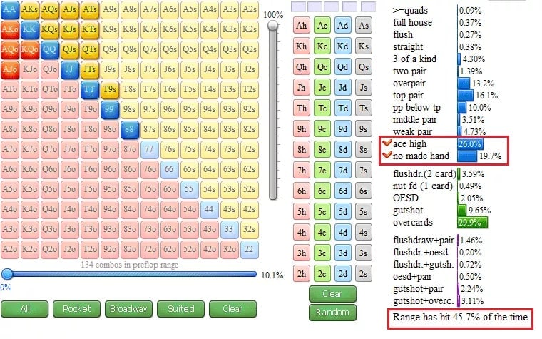 👍 Шире платите контбеты в позиции. Оппонент, который вас трибетнул, чаще всего поставит на флопе, в том числе и не попав в борд. Чтобы не дать ему печатать деньги, нужно чаще коллировать контбет. Даже тайтовый спектр 3-бета (10%) не попадет во флоп в 45.7% случаев (легко проверить во Flopzilla). Конечно, на бродвейных флопах у него преимущество по диапазону, а вот фолдить 44 на флопе J75 на контбет не стоит.