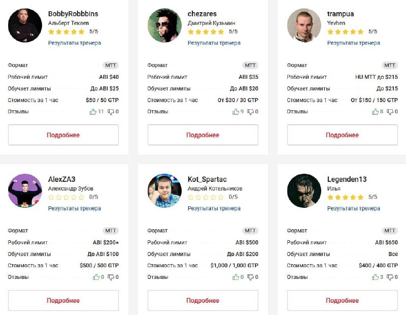 В разделе легко выбрать тренера под нужный бюджет, цены самые разные — от 1,200 рублей за тренировку до сотен долларов в час у топ-регов. Но учиться можно и бесплатно! Некоторые тренеры предлагают бекинг, а еще в разделе уже 6 фондов — 5 турнирных и кэш-фонд GreenLine. Так можно получить не только обучение, но и деньги на игру 👍