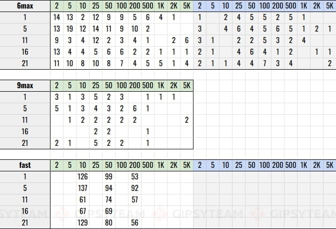 Подробности в таблице ниже: в первой колонке форматы и время (МСК), сверху лимиты, в центре количество активных столов. Зеленые колонки — холдем, синие — PLO. Мы недавно рассказывали, почему стоит оценить румы сети Chico. Если вы готовы наигрывать $300+ рейка в месяц, напишите @gipsyteamplus, чтобы получать дополнительный рейкбек.