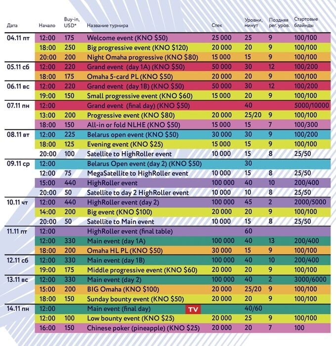 🏆 Турниры. Не только холдем! В расписании есть МТТ по PLO с 5, 6 и даже 7 картами. Также запланированы турниры по шортдеку и китайскому покеру.