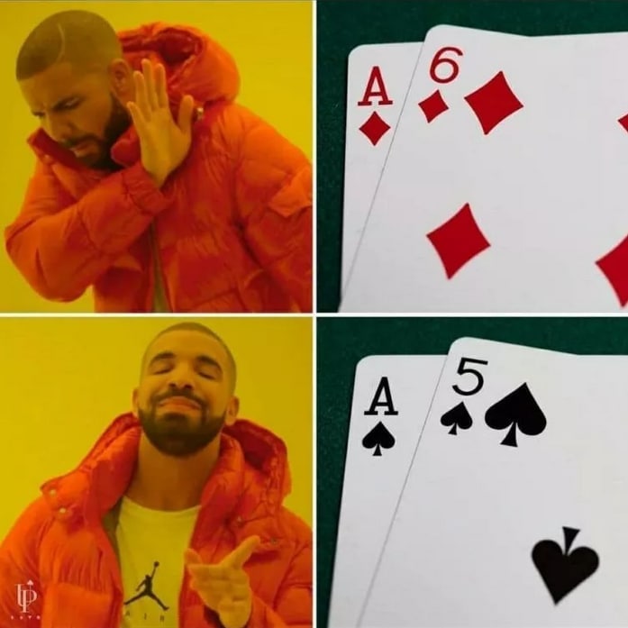🤷♂️ Если не попали во флоп. На шоудауне А5s играет так себе, зато с ней удобно блефовать. Ставьте с любыми дро, в том числе бекдорными. Если на терне купите настоящее флеш-дро, продолжайте ставить. А в 3бет-потах можно контбетить и без бекдоров — если на доске есть король или дама.