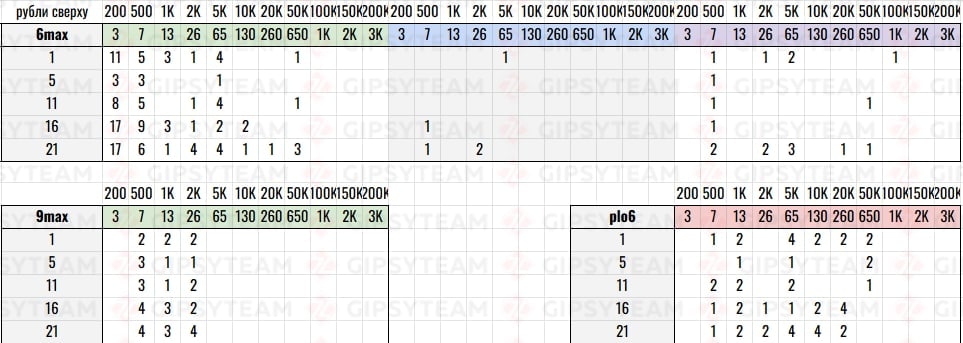 Подробности в таблице ниже: в первой колонке форматы и время (МСК), сверху лимиты в долларах и рублях, в центре количество столов. Зеленые колонки — холдем, синие — PLO, фиолетовые — PLO5, розовые — PLO6. О том, почему стоит оценить игру на Покердоме, мы рассказывали летом. В двух словах — высокий рейкбек и слабое поле.