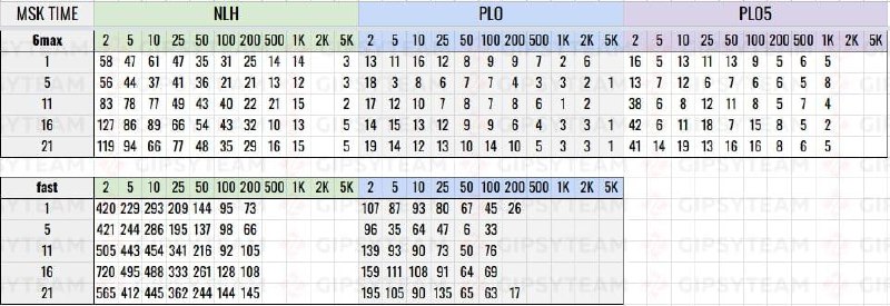 Подробности в таблице ниже: в первой колонке форматы и время (МСК), сверху лимиты, в центре количество столов. Зеленые колонки — холдем, синие — PLO, фиолетовые — PLO5. Если еще нет аккаунта на ПокерОК, напишите @gipsyteamsocial2. А если интересуют актуальные замеры трафика в других румах и специальные предложения для регуляров — обращайтесь к @gipsyteamplus