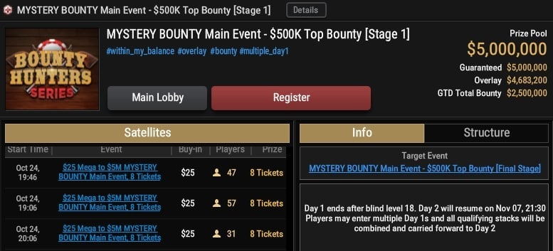 На ПокерОК гремит Bounty Hunters Series с гарантией $50 млн. Закончится он турниром в самом популярном формате этого года, Mystery Bounty. Бай-ин — $210, гарантия — $5,000,000, самый большой баунти составит $500,000. Отобраться в мейн можно во множестве сателлитов 👇