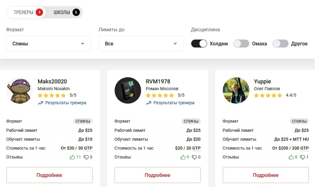 Месяц назад на нашем сайте заработал раздел «Обучение» — самый простой способ найти тренера по покеру. Все это время там появлялись новые профили, предложений уже почти вдвое больше, чем на старте! Вот как раздел выглядит сегодня: