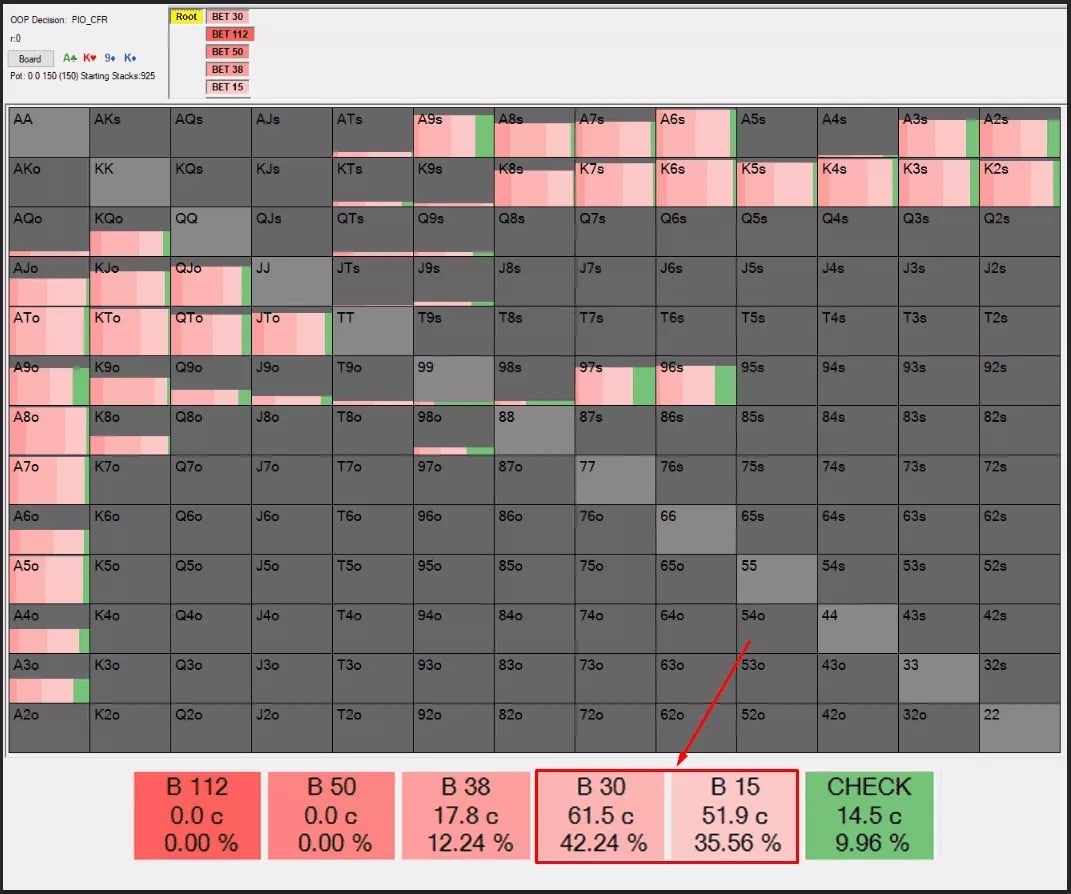 2️⃣ 3бет-поты с А на флопе. Вы поставили трибет с SB против MP и получили колл, флоп A♦️ J♦️ 8♣️. Блефов на таком борде у вас почти не будет, а диапазон настолько силен, что солвер с огромной частотой просто выбирает бет в 15% банка.
