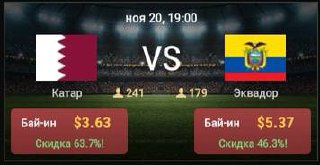⚽️ До окончания матча. При внесении бай-ина можно выбрать флаг одной из команд-участниц и получить скидку, которая зависит от шансов соперников по данным букмекеров. Выбор аутсайдера поможет сэкономить больше денег.