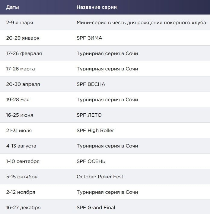 Опубликовано и расписание турнирных серий в казино «Сочи» (даты есть, часть фестивалей пока без названий). 2022-й там закончится финалом Russian Poker Championship, объединенным с SPF Grand Final — серии пройдут с 16 по 28 декабря. Сразу после нового года начнется мини-фестиваль в честь дня рождения клуба, а дальше серии будут идти нон-стопом одна за одной: всего 13 фестивалей за 12 месяцев. Первый крупный в 2023-м — SPF Зима с 20 по 29 января ❄️