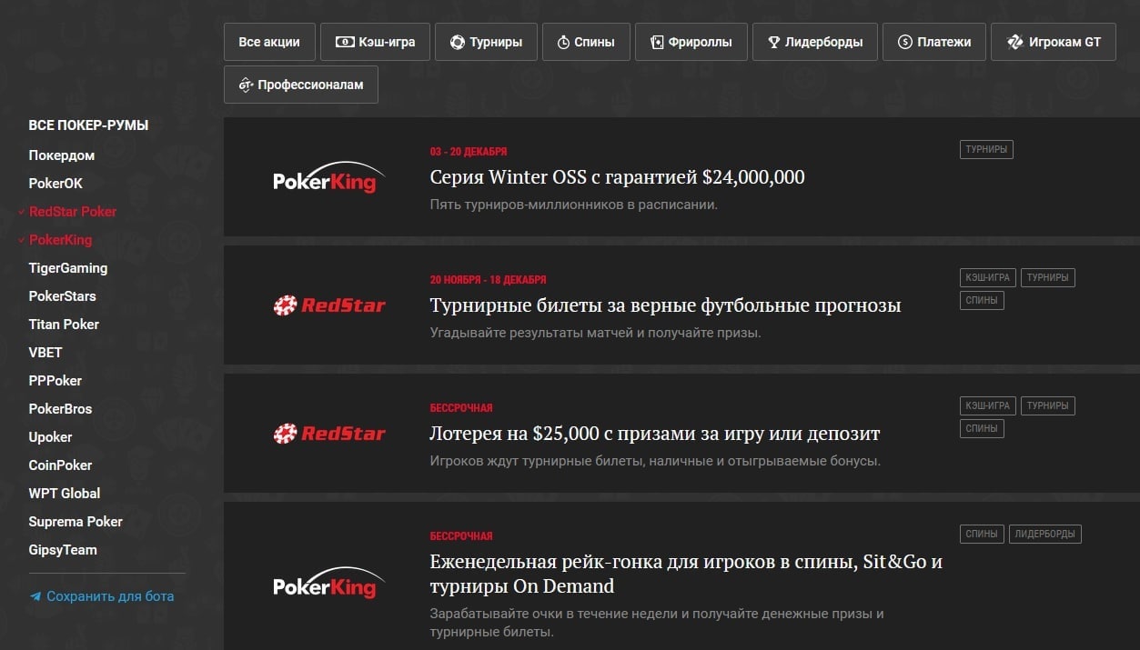 Покер-румы постоянно анонсируют и проводят акции: турнирные серии, релоад-бонусы, рейк-гонки, лидерборды и розыгрыши. Все их мы собираем в специальном разделе на GipsyTeam и подробно описываем условия участия. А удобные фильтры помогают выбрать только румы и дисциплины, которые вам интересны 👍