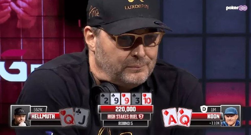 👉 «Пуш Джейсона такой необычный, что я даже устроил опрос в твиттере. Читатели сошлись на том, что Кун решил, что руки вроде АК и AQ пушили бы префлоп, а у поплывшего к концу матча Хельмута в 3-бете есть и мусор. Возможно, Джейсон в этот момент вспомнил нашумевшую раздачу, когда Фил сыграл 3бет-колл с Q4o!»