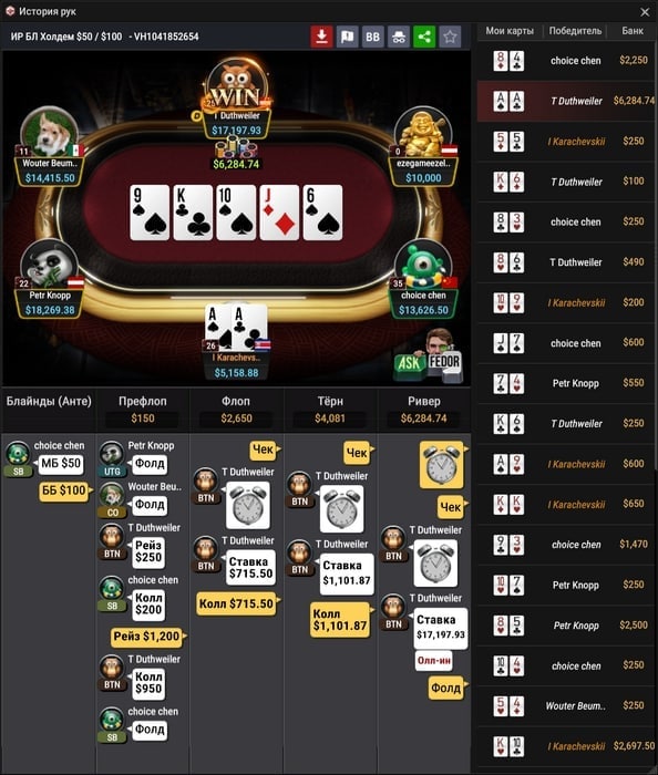 3️⃣ Последняя раздача, блайнды 3k/6k, у Хельмута 17 ББ. Кун зарейзил 12k с Q♣️ 8♦️, Фил переставил с A♦️ K♣️ до 35k, Джейсон запушил и победил.