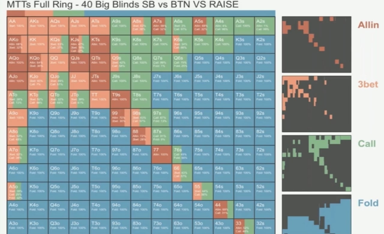 👨💻 Дальше снова в дело идет знание GTO. Если видите, что оппонент часто фолдит, добавляйте больше блефов, чем предлагает солвер. А если соперник даже без позиции коллирует 3-беты широко, игнорируйте советы солвера и убирайте все блефы (но расширяйте велью-диапазон).