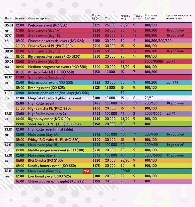 👉 Новинки. Организаторы не устают экспериментировать: запланированы турнир по китайскому покеру с джокерами, нокаут по шортдеку и аж 3 входных дня в один из самых популярных турниров серии — Grand Event.