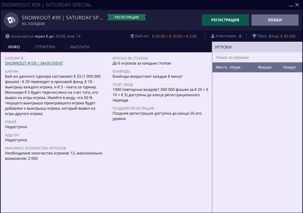 Мы же разыграем 5 билетов на турнир SnowkOUT #39 Saturday Special за €33 с гарантией €30,000, который начнется 14 января в 20:30. Чтобы принять участие в розыгрыше, просто нажмите на кнопку в следующем посте и обязательно оставайтесь подписанными на наш канал. Победителей беспристрастный бот выберет 8 января в 15:00.