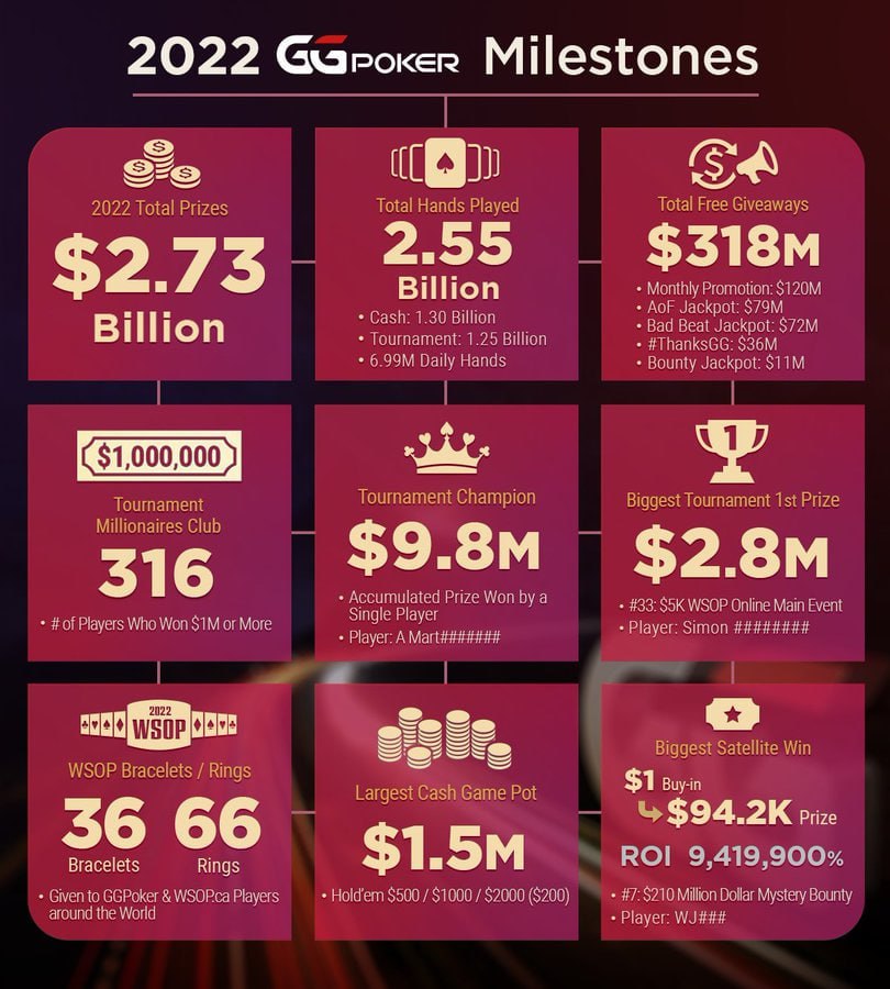 Сеть GGPoker поделилась в твиттере итогами 2022-го. Вот несколько интересных цифр: