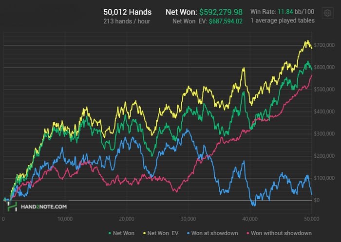 👉 Играя дешевле, вы заработаете больше. Предположим, А-игра приносит вам 5 ББ на 100 рук на NL1K и 7.5 ББ на 100 рук на NL500. Когда вы играете слабее, винрейты не будут понижаться пропорционально. Скорее всего, Б-игра будет приносить, скажем, 1 ББ на 100 на NL1K и 4 ББ на 100 на NL500. Так что нижний лимит гриндить станет в 2 раза выгоднее.