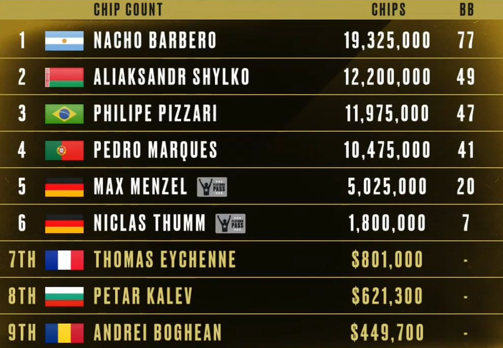 Состав финалки и стеки смотрите ниже. Интересно, что оба немца-шортстека попали в турнир через Platinum Pass, то есть или отобрались через сетку сателлитов, или вообще играют фриролл. Благодаря Platinum Pass в 2019-м оказался на Багамах и предыдущий чемпион PSPC, Рамон Колильяс (получил за победу $5.1 млн). Трансляция с открытыми картами начнется сегодня в 21:00 на твиче PokerStars.