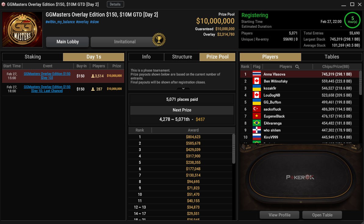 Играть можно сколько угодно первых дней (без реэнтри), в день 2 проходит лучший стек. Чиплидер в финале — загадочный игрок из Таиланда Анна Власова с 298 ББ. Второй стек у Бена Вилинофски (224 ББ), замыкает тройку лидеров украинец kozak9r (218 ББ) с $641 призовых на GG. Играть сегодня будут, пока не останется 16 человек, продолжится турнир завтра вечером. Приз за первое место (пока что) — $804k. Желаем удачи всем, кто участвует и отбирается!