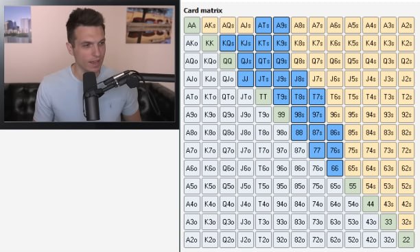 👉 Диапазон Тараса (скриншот внизу). «Я добавил туда не слишком вероятные KQ и KJ, но и все сеты для баланса. Получаем больше 29% эквити у АК. Заданный диапазон может быть широковат, но Т7s ведь там как-то оказались! В любом случае это сложный и неприятный спот, но важно понимать, что колл совсем не такой странный, как может показаться».