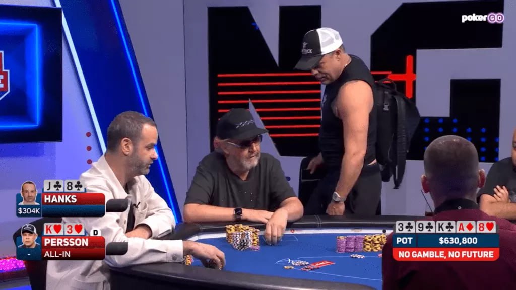 👉 Терн А♦️, банк $107,600. Китинг чек, Хэнкс чек. Перссон поставил $35,000, Китинг колл, Хэнкс переставил до $115,000 с флешем, Перссон запушил $244,000, Китинг сфолдил. Хэнкс заплатил и по риверу 8♥️ выиграл банк $630,800.
