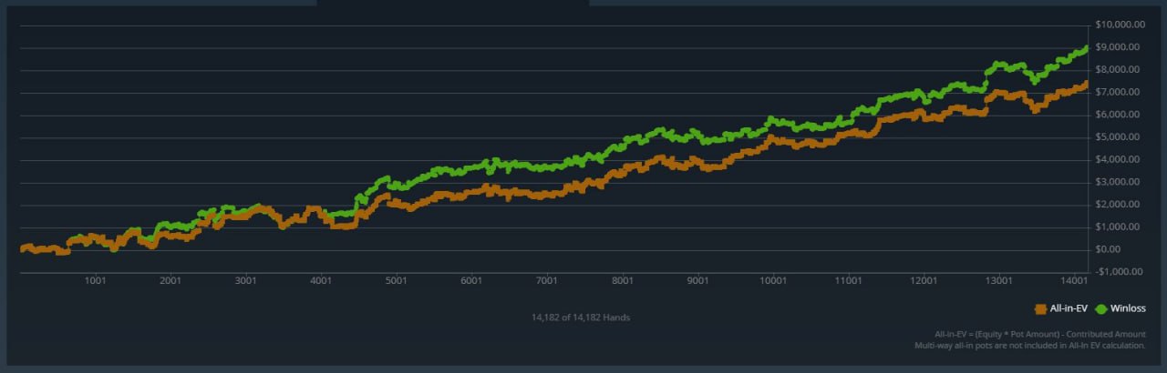 👀 И что в итоге? С вероятностью 70% солвер не побьет NL25. И не только из-за рейка: и ZOOM500 он, скорее всего, не побьет, ведь там регуляры тоже играют близко к GTO. И это идеальная иллюстрация того, что копировать солверные решения бесполезно. GTO надо изучать только для того, чтобы за столами находить эксплойты еще эффективнее.