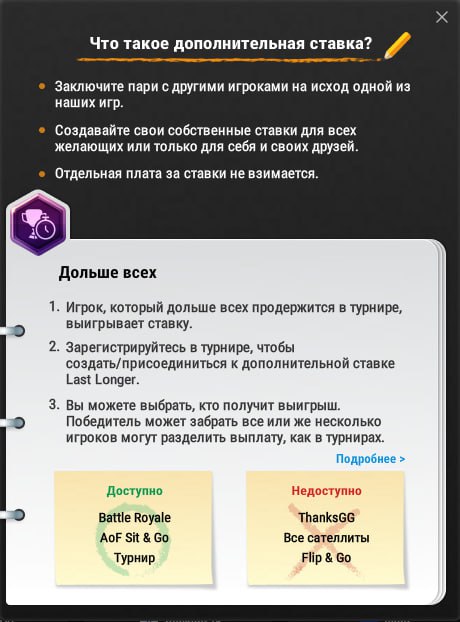 9️⃣ Большое обновление на ПокерОК. За столами теперь можно отправлять голосовые сообщения, в 6-макс спинах появились лимиты $5 и $20, а в пятикарточной омахе карты на префлопе будут показывать только когда до вас дойдет ход — это поможет бороться с тимплеем. Но главная новость касается МТТ: теперь можно заключить ластлонгер, т.е. пари с другими участниками на последнего оставшегося. Выбираете турнир, сумму ставки (от 10% до 200% бай-ина) и формат: публичный для всех участников или приватный для споров с друзьями.