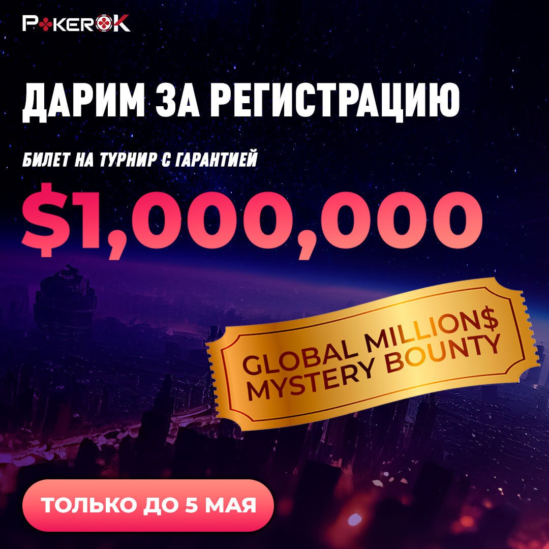 Если вы еще не играли в самом крупном покер-руме, ПокерОК предлагает небольшой, но приятный бонус: до 5 мая можно получить билет за $5 на турнир Global MILLION$ Mystery Bounty 1 Million 🎁