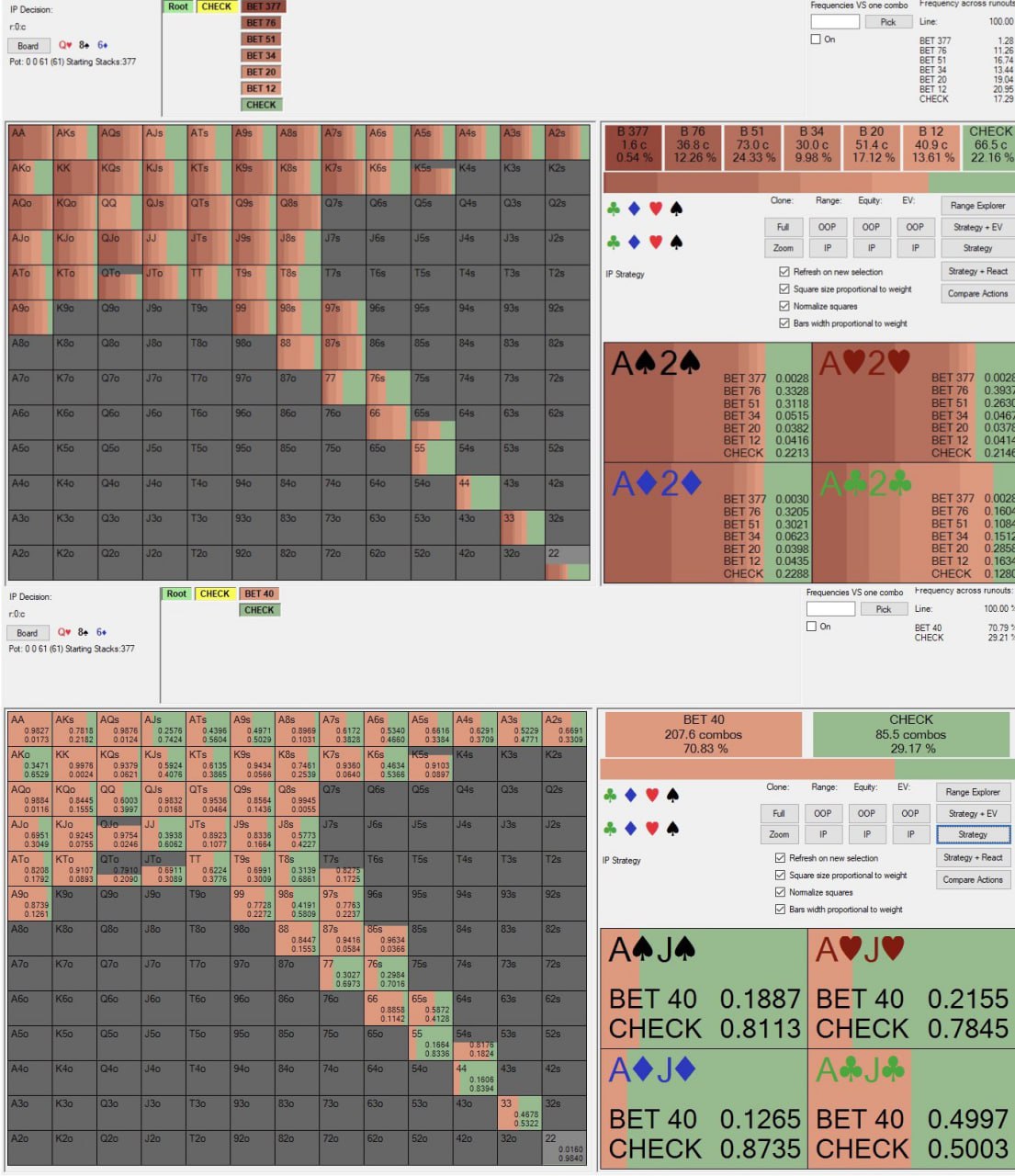 👇 Посмотрите на скриншоты внизу. Верхний не дает ничего полезного, потому что задано слишком много сайзингов и огромное количество стратегий. Какие выводы вы сделаете из этих расчетов, как примените их в игре? Теперь посмотрите на нижний скриншот — это та же самая ситуация, но задан только один сайзинг. И EV примерно то же самое! А урок становится простым и очевидным: ставьте часто и крупно на бордах, где у вас преимущество по натсам, но не так много эквити.