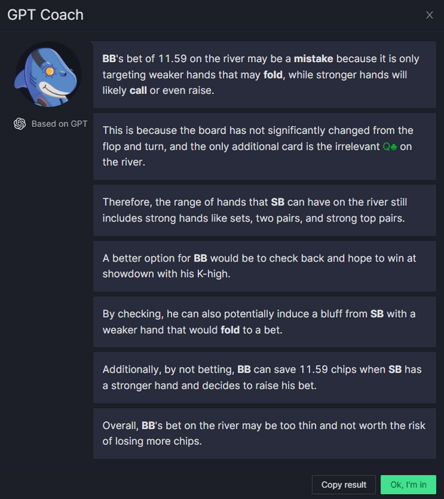 ⚡️Большое обновление GTOBase. Находить и разбирать ошибки теперь можно с помощью GPT Coach, искусственного интеллекта на основе нейросетей. Также добавили новые фильтры для GTO Trainer, библиотеки для 6-макс кэша и МТТ, четыре уровня подписок и возможность бесплатно загрузить для анализа 25,000 рук.