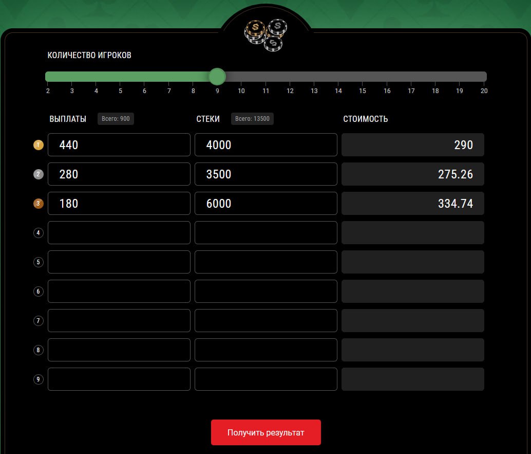 Теперь очень легко определить стоимость своего стека — хоть в поздней стадии турнира в онлайне, хоть в домашней игре. Самому считать все по многоэтажной формуле долго и скучно, а главное — совсем не обязательно. Наш калькулятор все сделает за секунду. Пользоваться им очень просто: