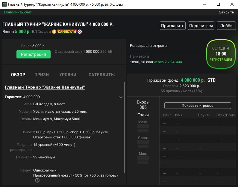 🏆 18:00, главный турнир. Бай-ин 5,000 рублей, гарантия 4 миллиона. Стартовый стек 250 ББ, уровни по 20 минут — шикарный турнир за эти деньги, не пропускайте.